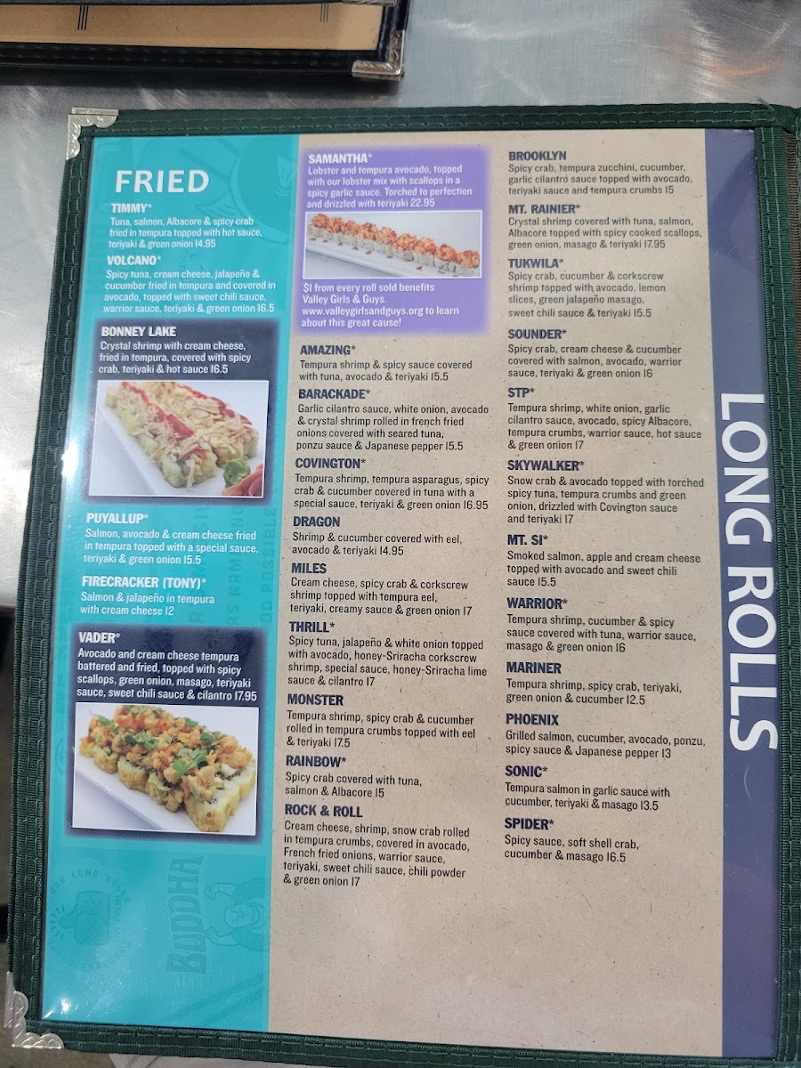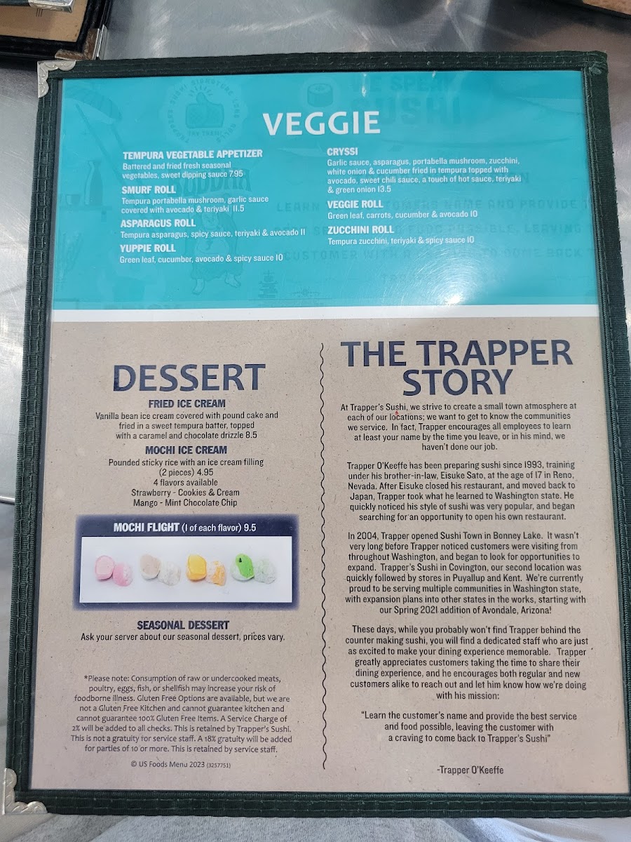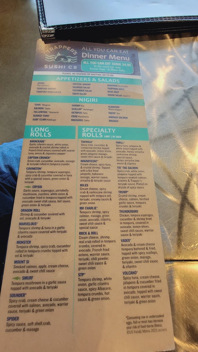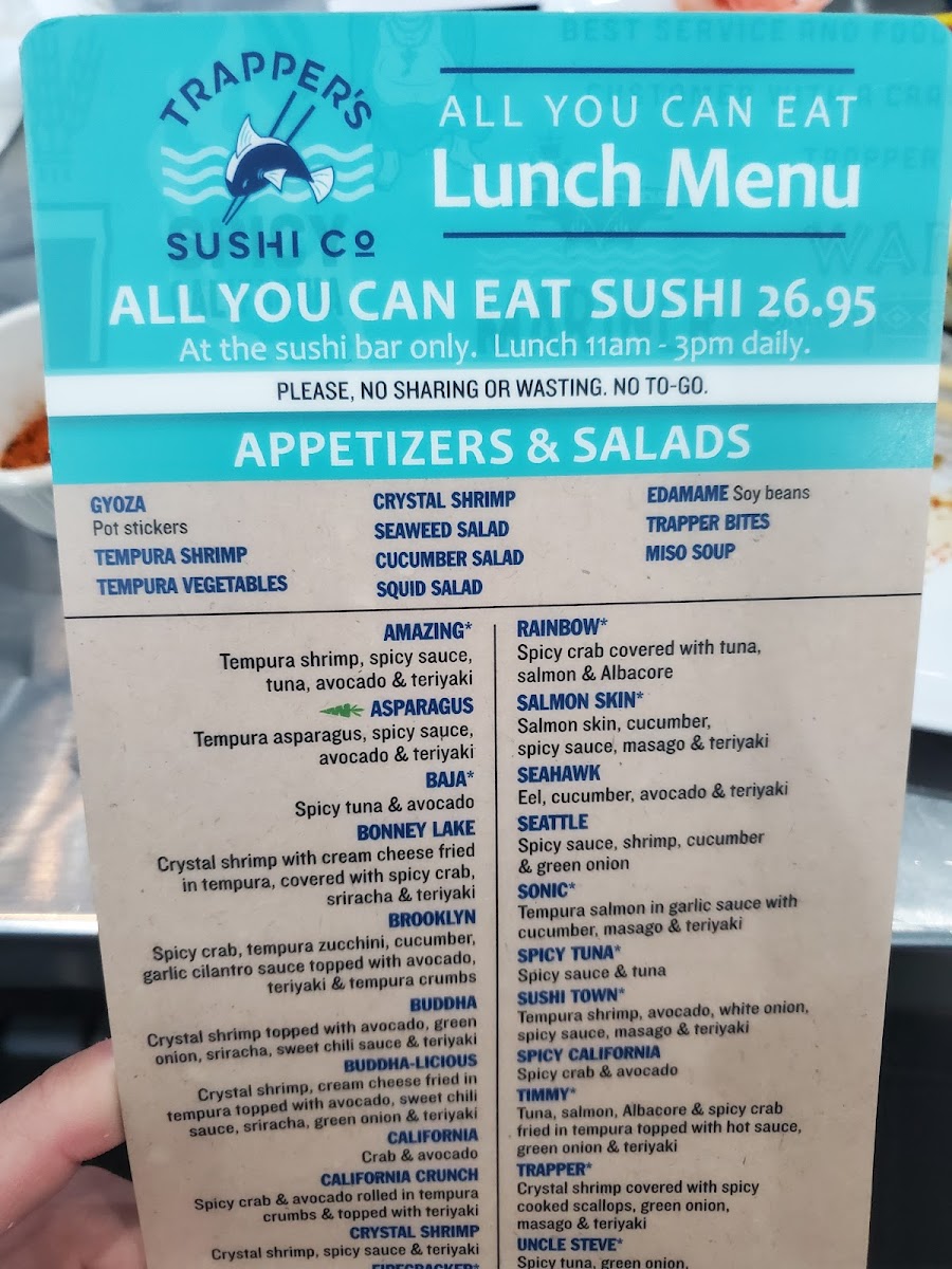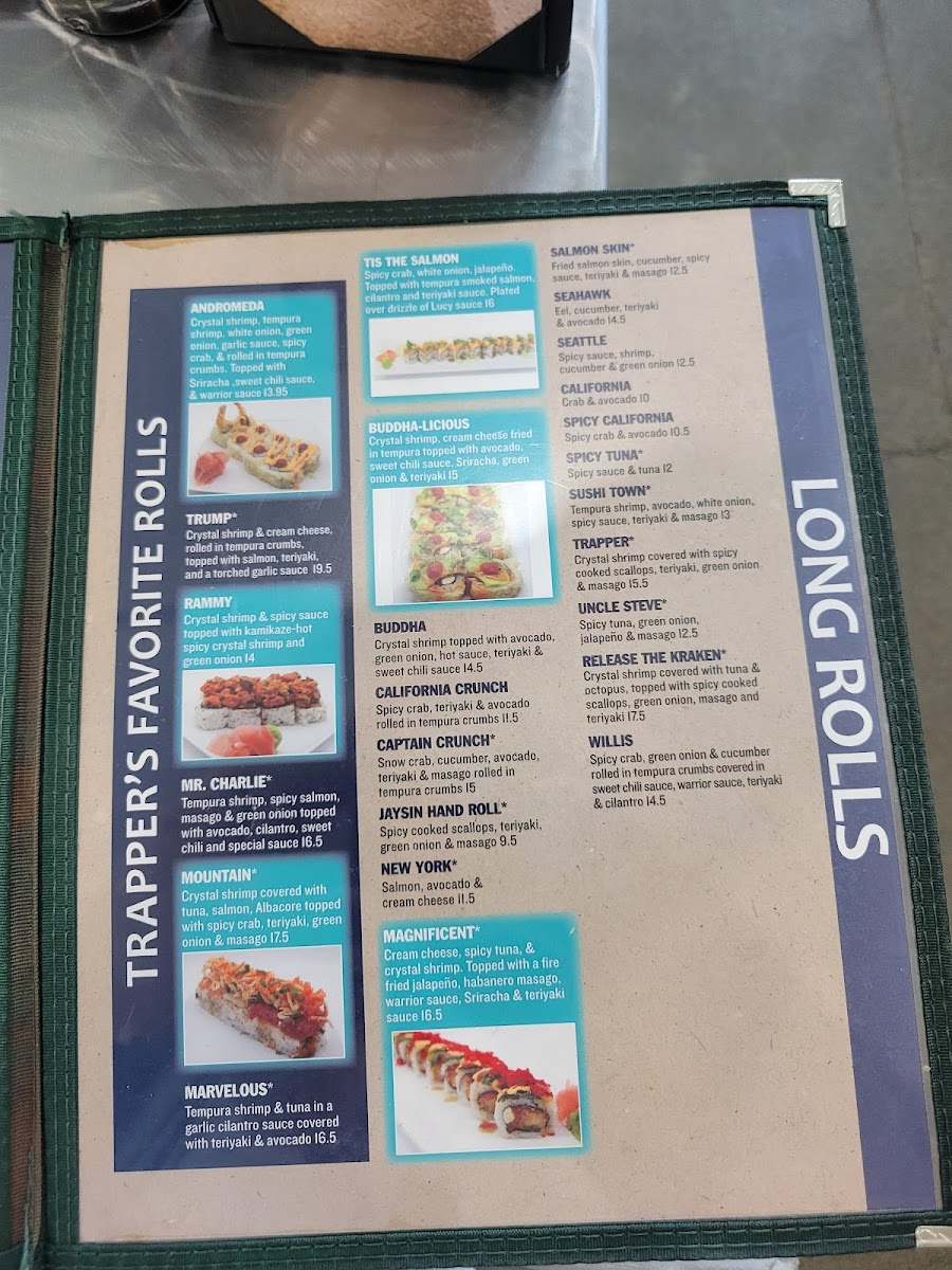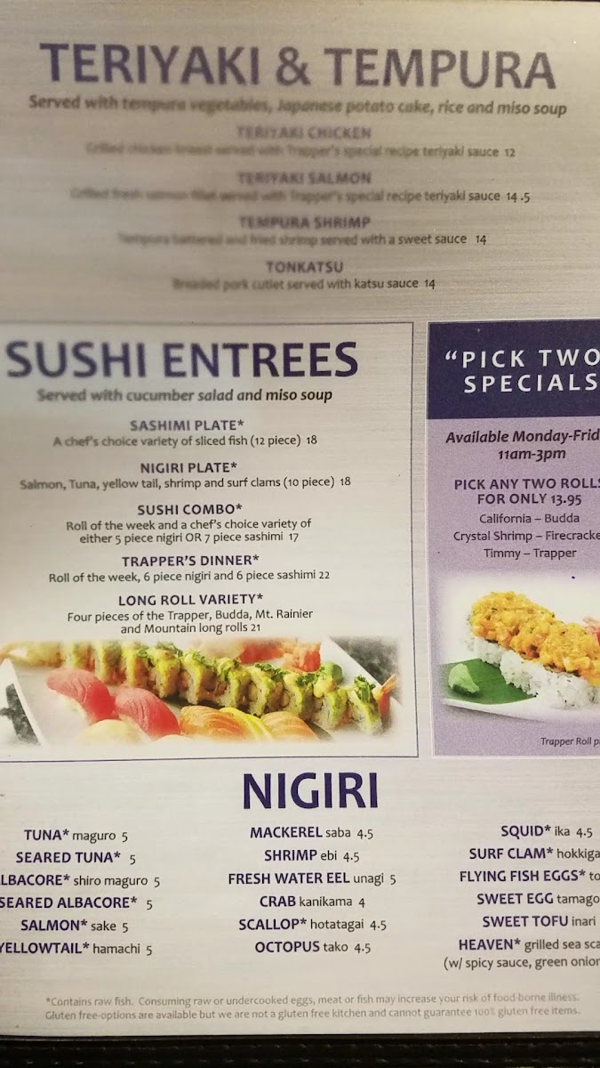 Welcome to Trapper's Sushi - Lacey, a hidden gem located at 1360 Galaxy Dr NE, Lacey, WA. This inviting establishment offers a diverse menu that caters to sushi lovers and newcomers alike. Start your meal with their signature Shrooman Portabella, a delightful blend of spicy tuna and cream cheese, or opt for the crispy Tempura Shrimp and fresh vegetable tempura.